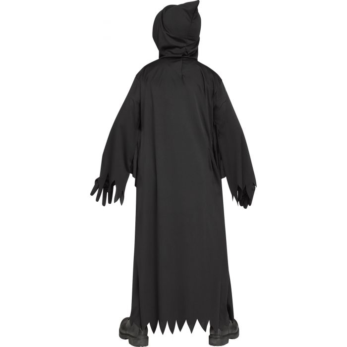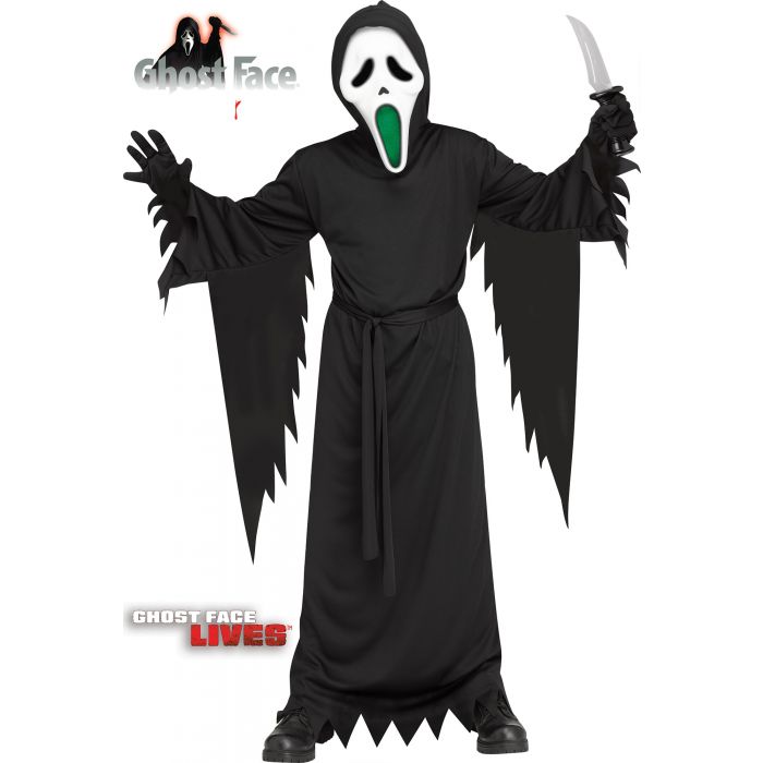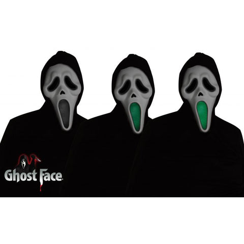 Features Black, Knit Poly Full-Length Hooded Robe, with Long Sleeves. Robe has Sawtooth Hem and Sleeve Hems, Matching Tie Belt and Gloves. And a Classic Ghost Face® Mask with Electronic Fade In/Out Mouth Mechanism and Battery Box.